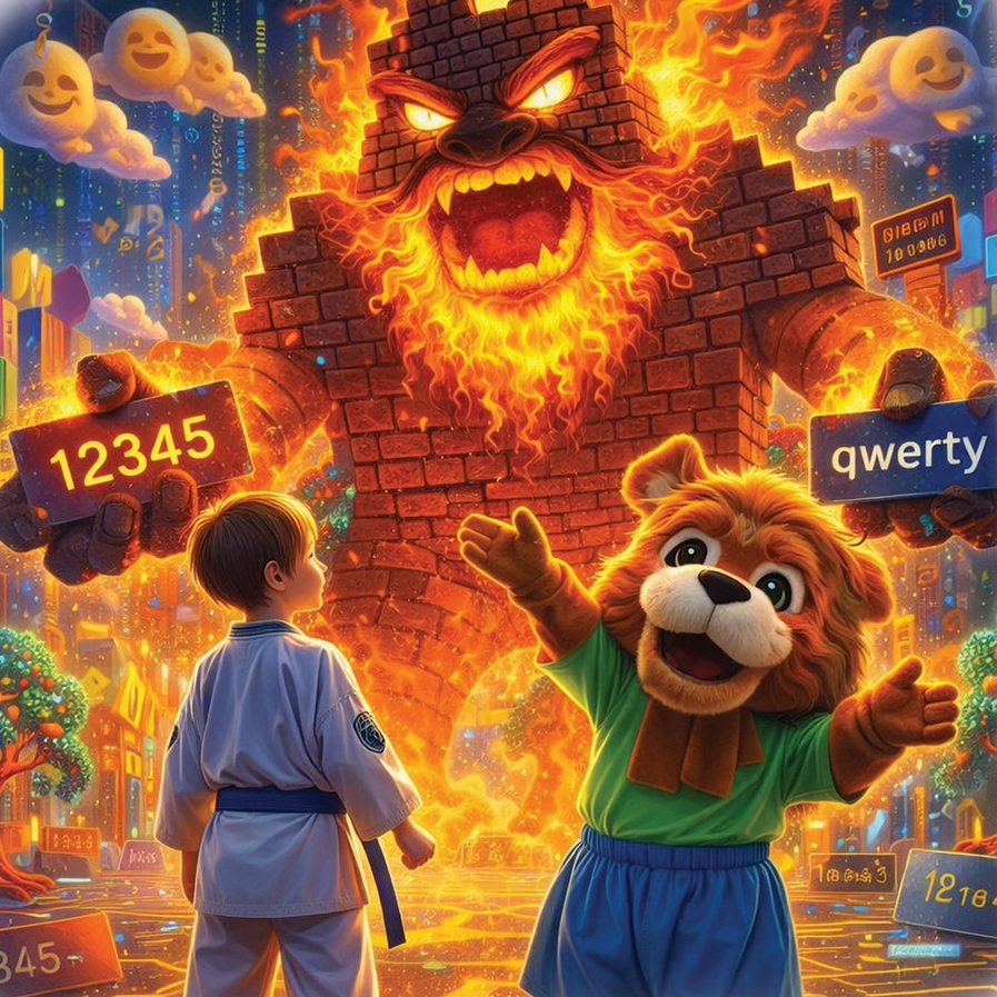 Я пробую: «12345» – великан смеётся так, что с неба сыплются кирпичики. «qwerty» – он фыркает пламенем. Я напрягаю фантазию: «Лёвушка_2026!» Великан довольно кивает и пропускает нас.