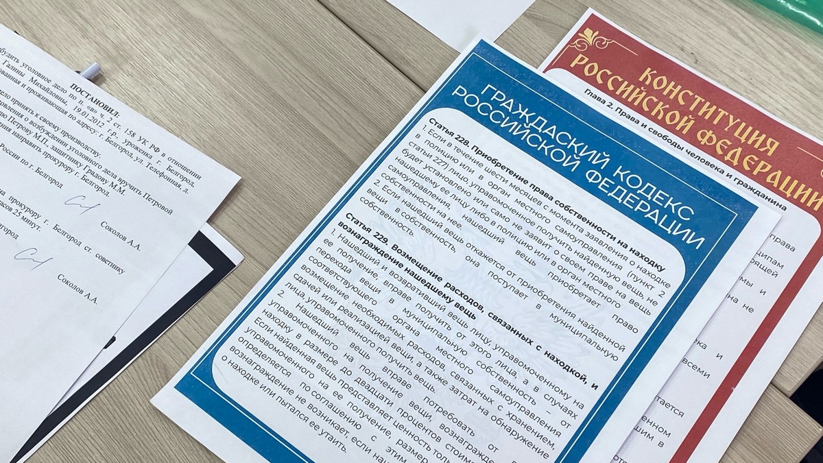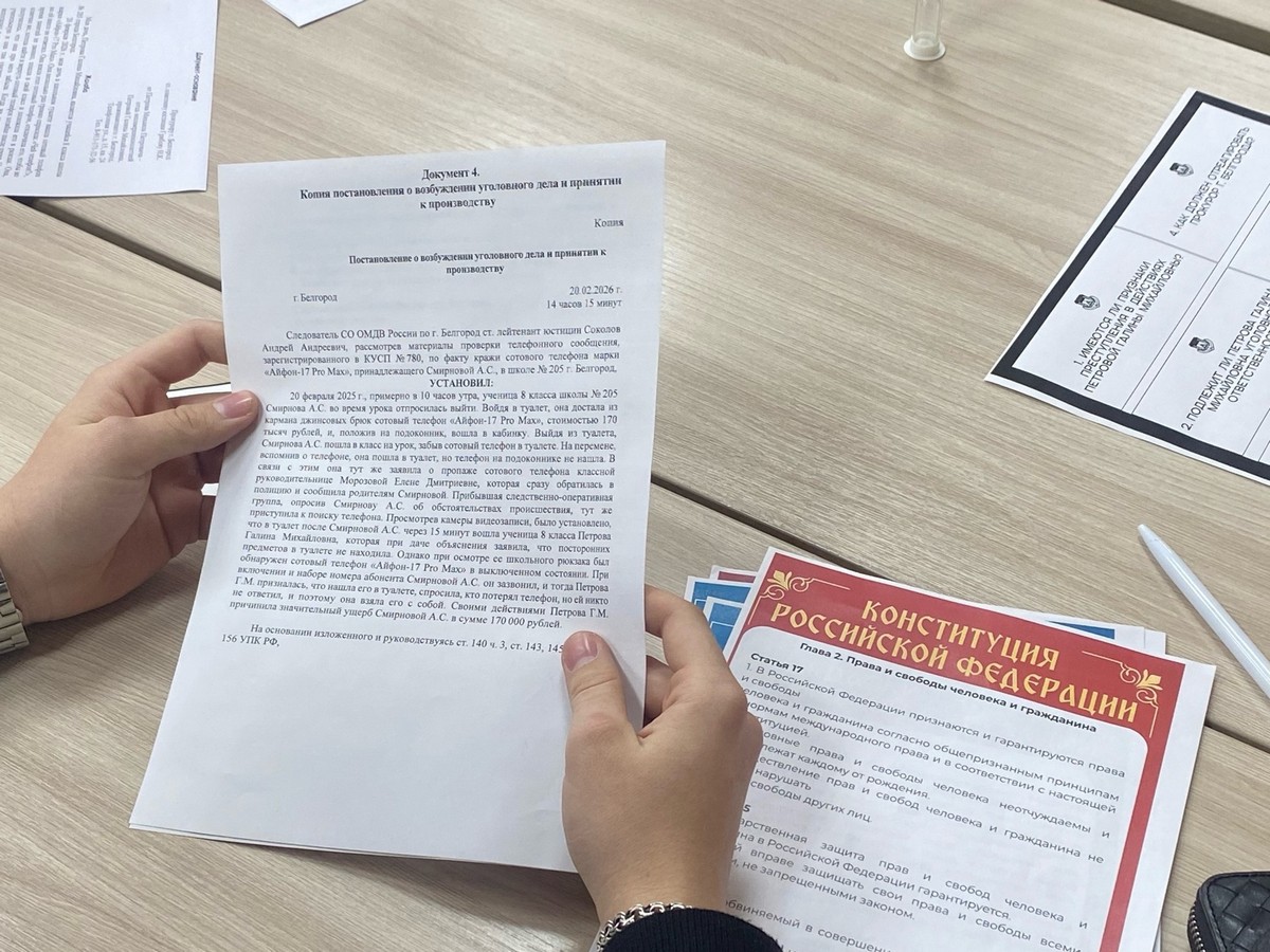 Тема прошедшего занятия — «Кража или находка?». По условию ученица восьмого класса Галина Петрова на перемене в школе нашла в туалете оставленный кем‑то мобильный телефон и забрала его, никому не сообщив об этом. После того, как хозяйка устройства Анастасия Смирнова обнаружила его пропажу, в школу прибыла полиция. Галя сказала, что ничего не находила, но выключенный гаджет обнаружили в её рюкзаке… И это стало поводом к возбуждению уголовного дела.