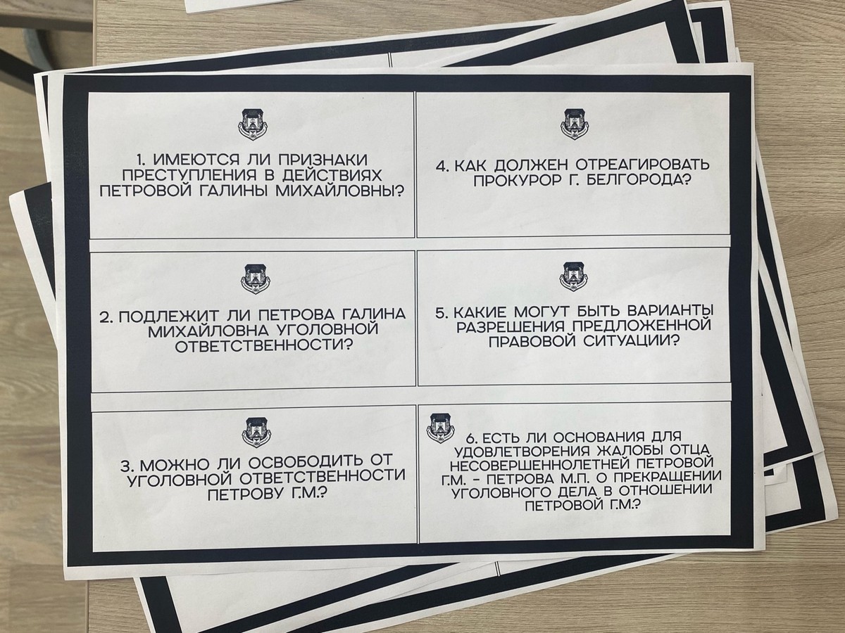 Студенты юридического института выступили в роли актёров — сторон по делу: папа подозреваемой, её адвокат, следователь по делу и пострадавшая. Школьникам раздали бланки с вопросами по правовым аспектам ситуации, на которые им нужно было ответить в конце прохождения задания, и поделили на четыре команды-станции. Участники по очереди перемещались по четырём локациям, где в течение десяти минут слушали комментарии актёров, знакомились с документами, задавали уточняющие вопросы и обсуждали новые детали.