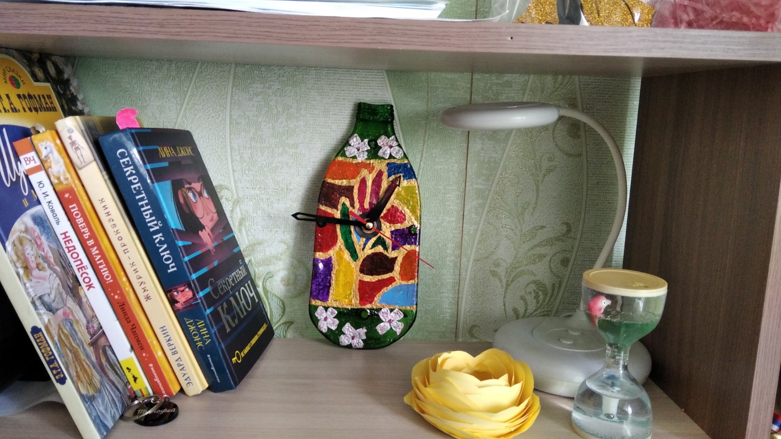 На суд жюри школьница представила свою работу «Часы счастья». Это настенные часы, которые она смастерила из стеклянной бутылки (подробнее о них – здесь).