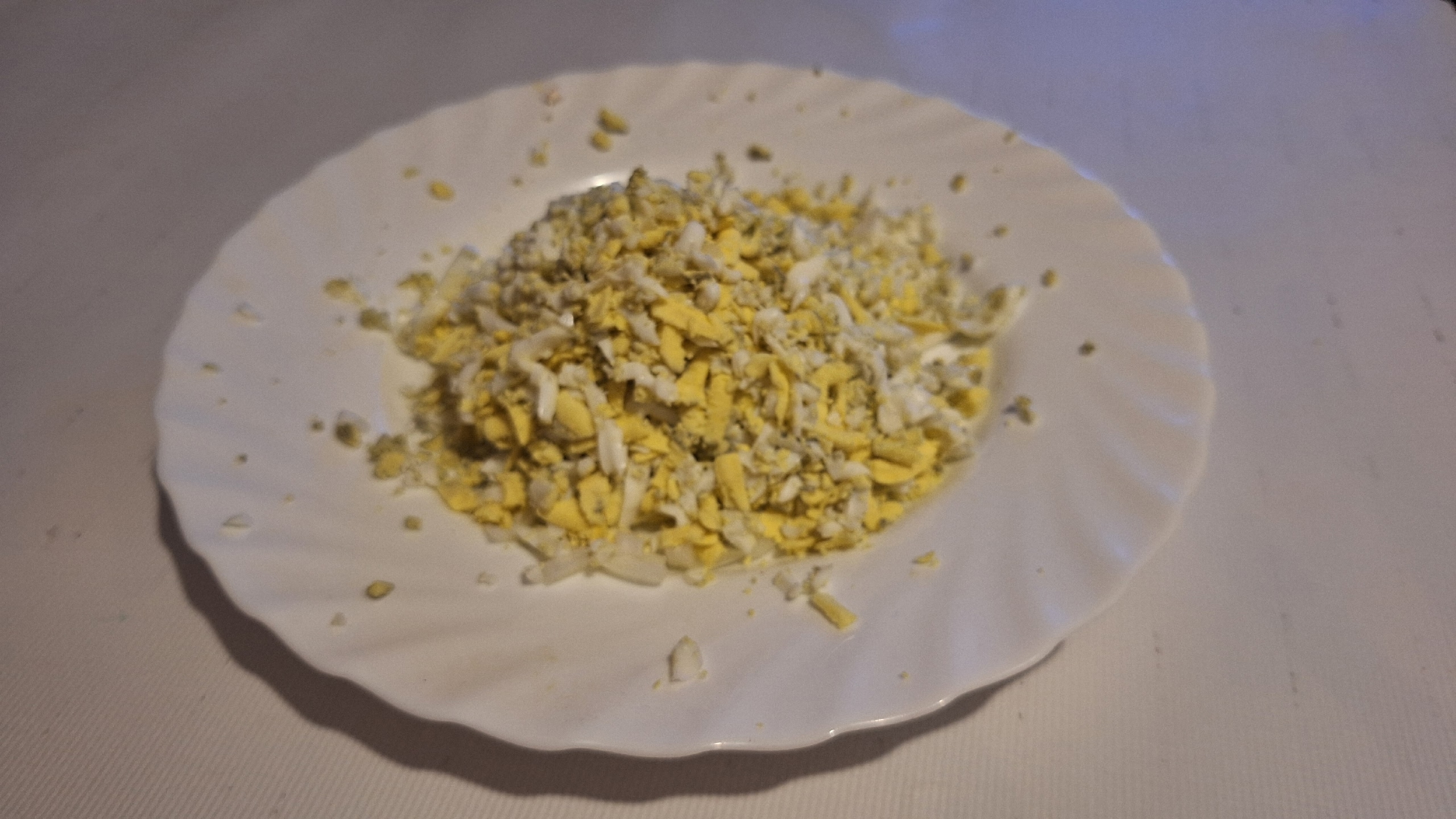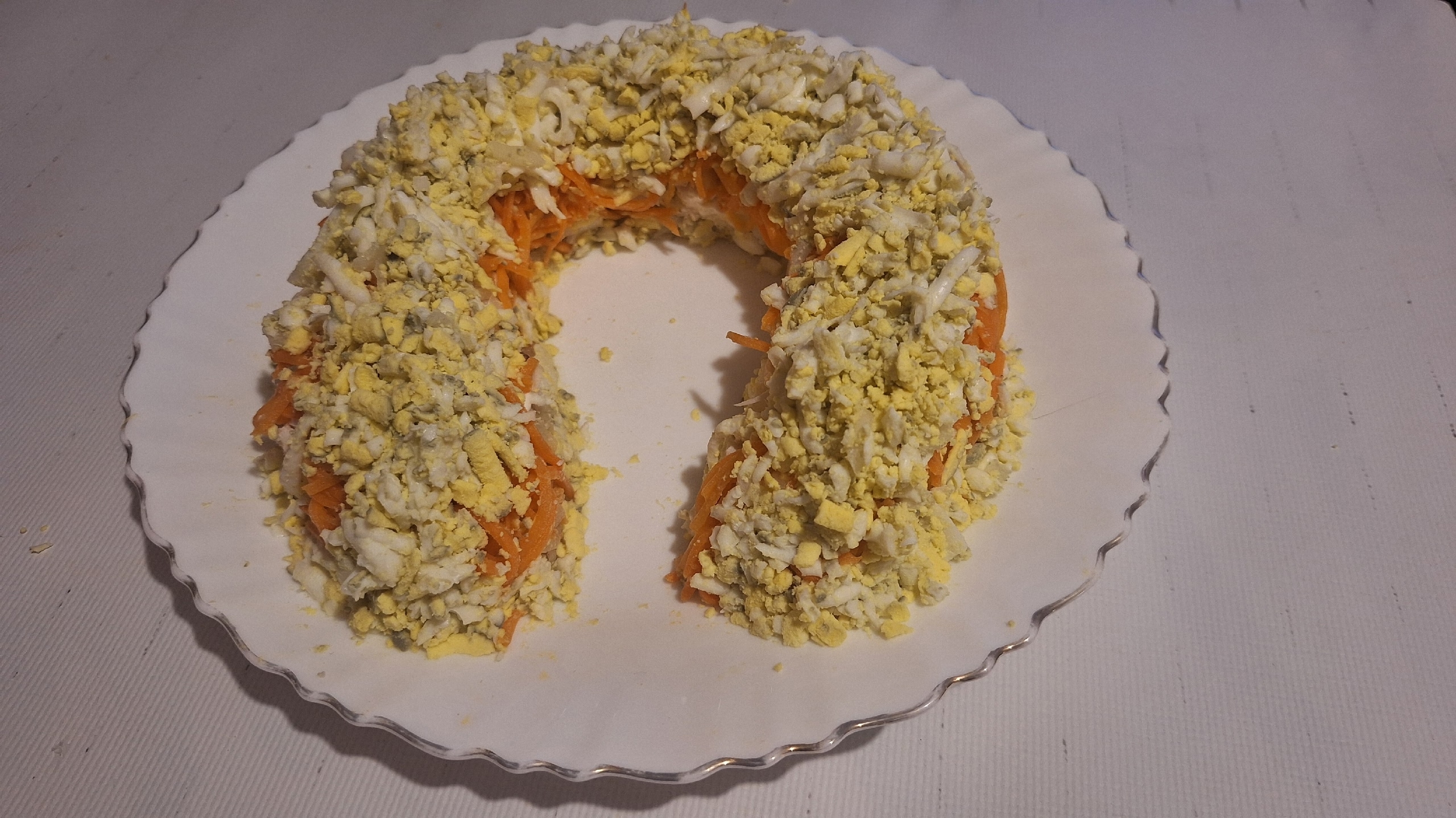 5. Сверху морковки выкладываем натёртые на крупной тёрке яйца.