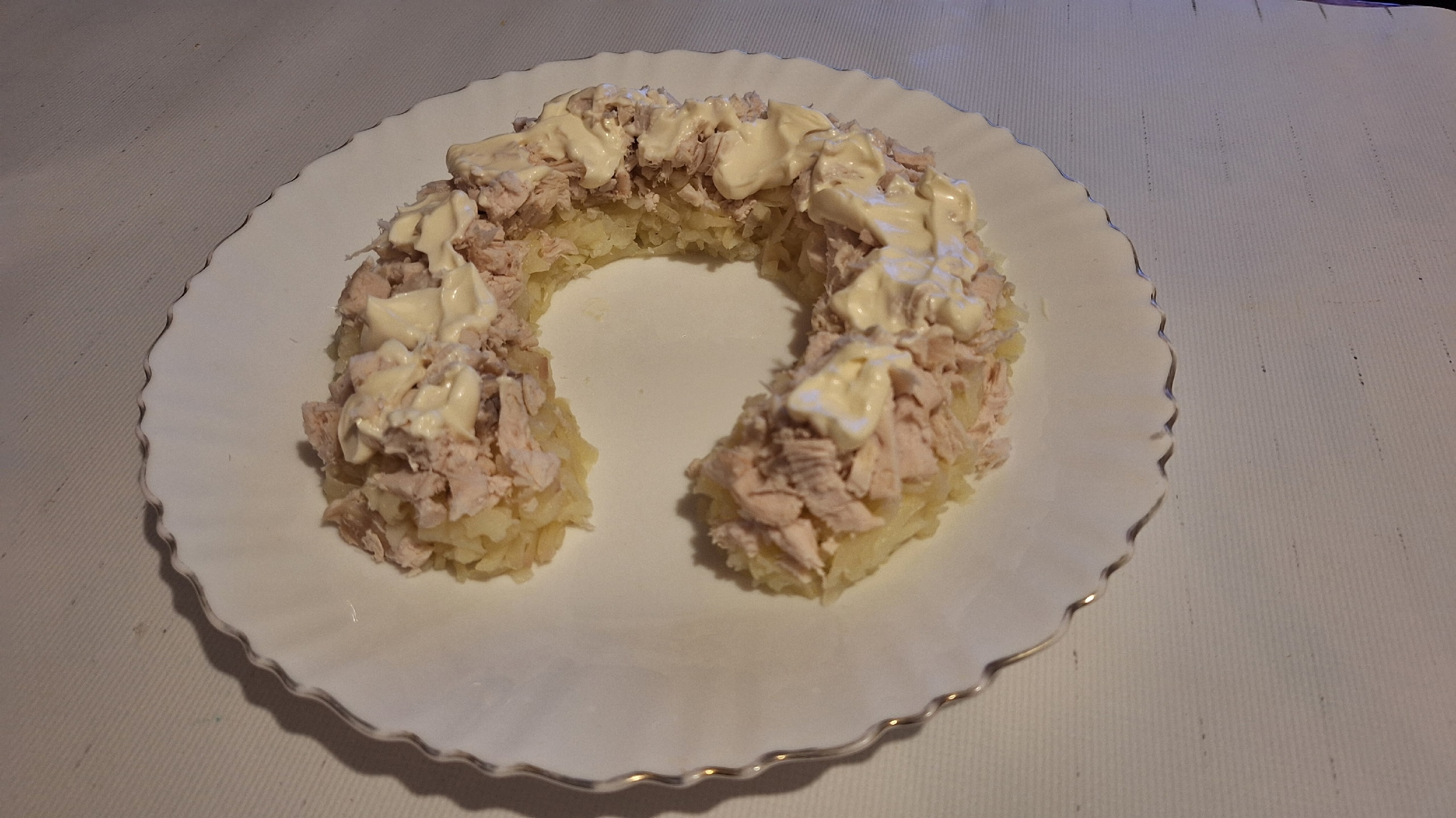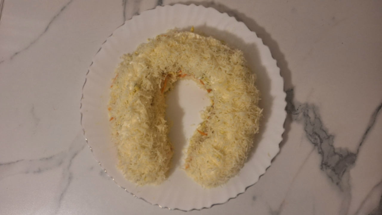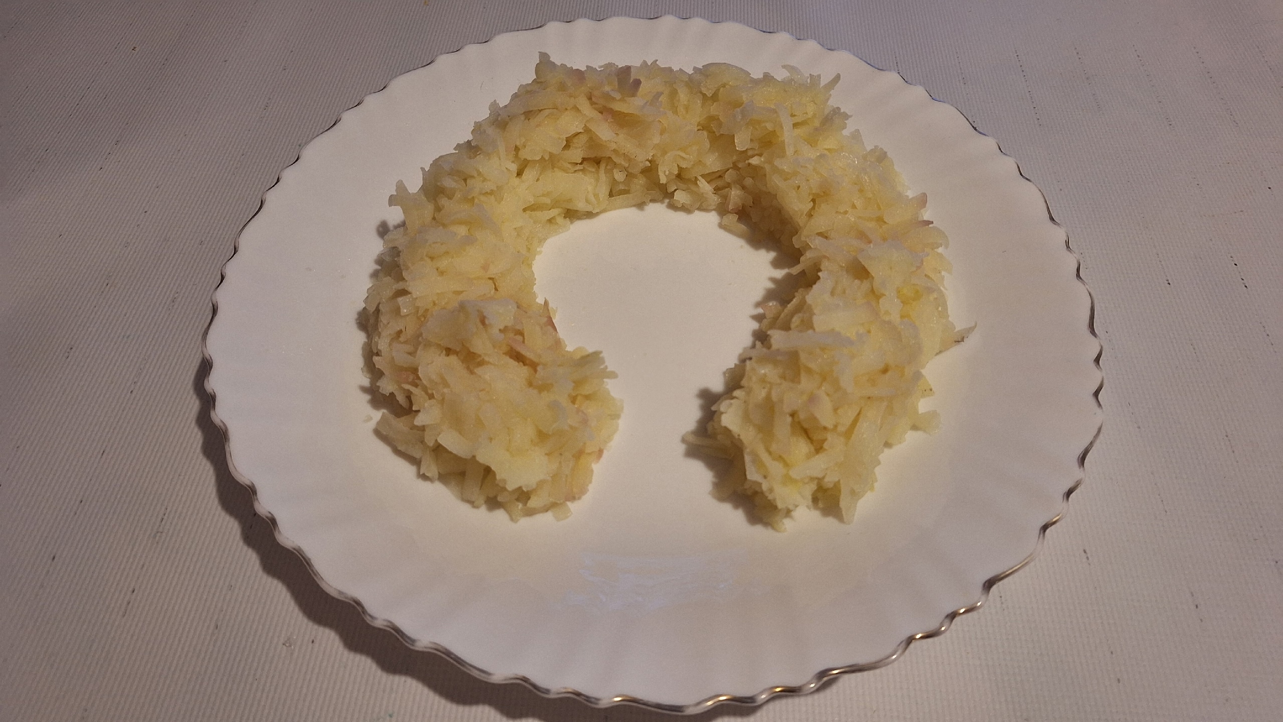 1. Натираем на крупной тёрке картофель. Выкладываем его на плоскую тарелку в форме подковы, сверху наносим майонез.