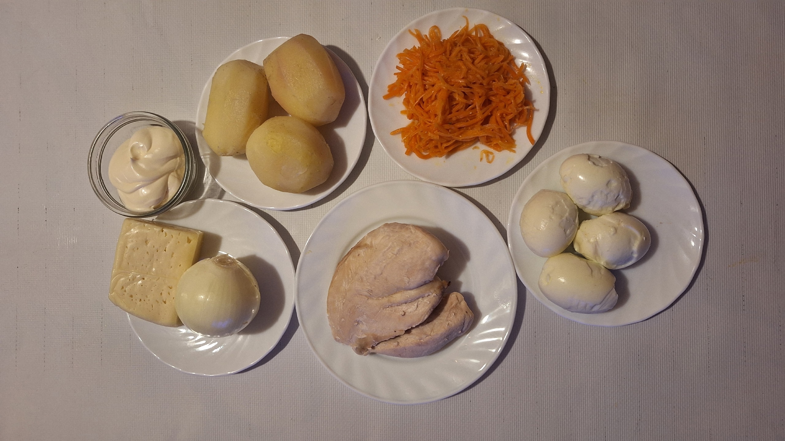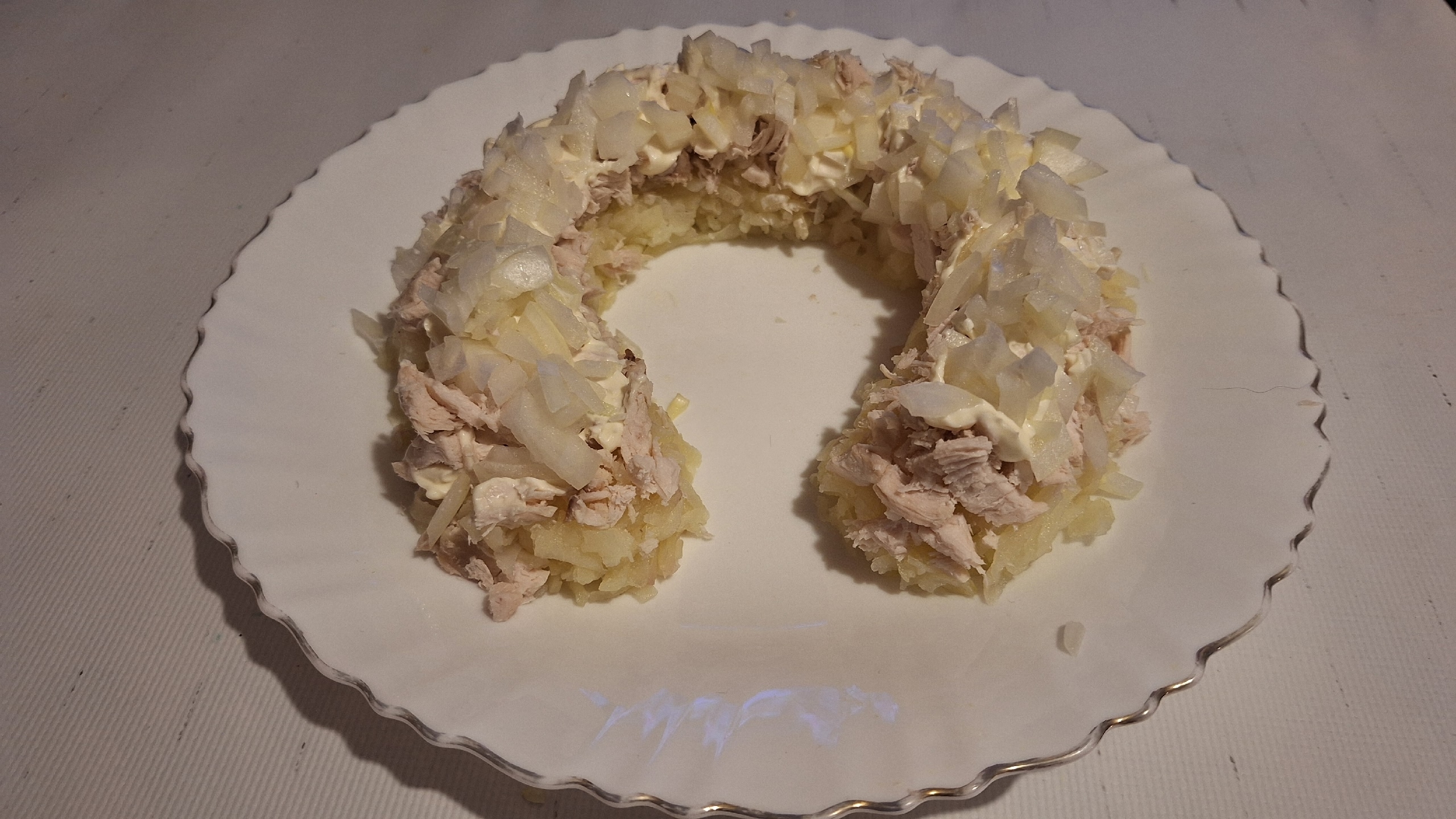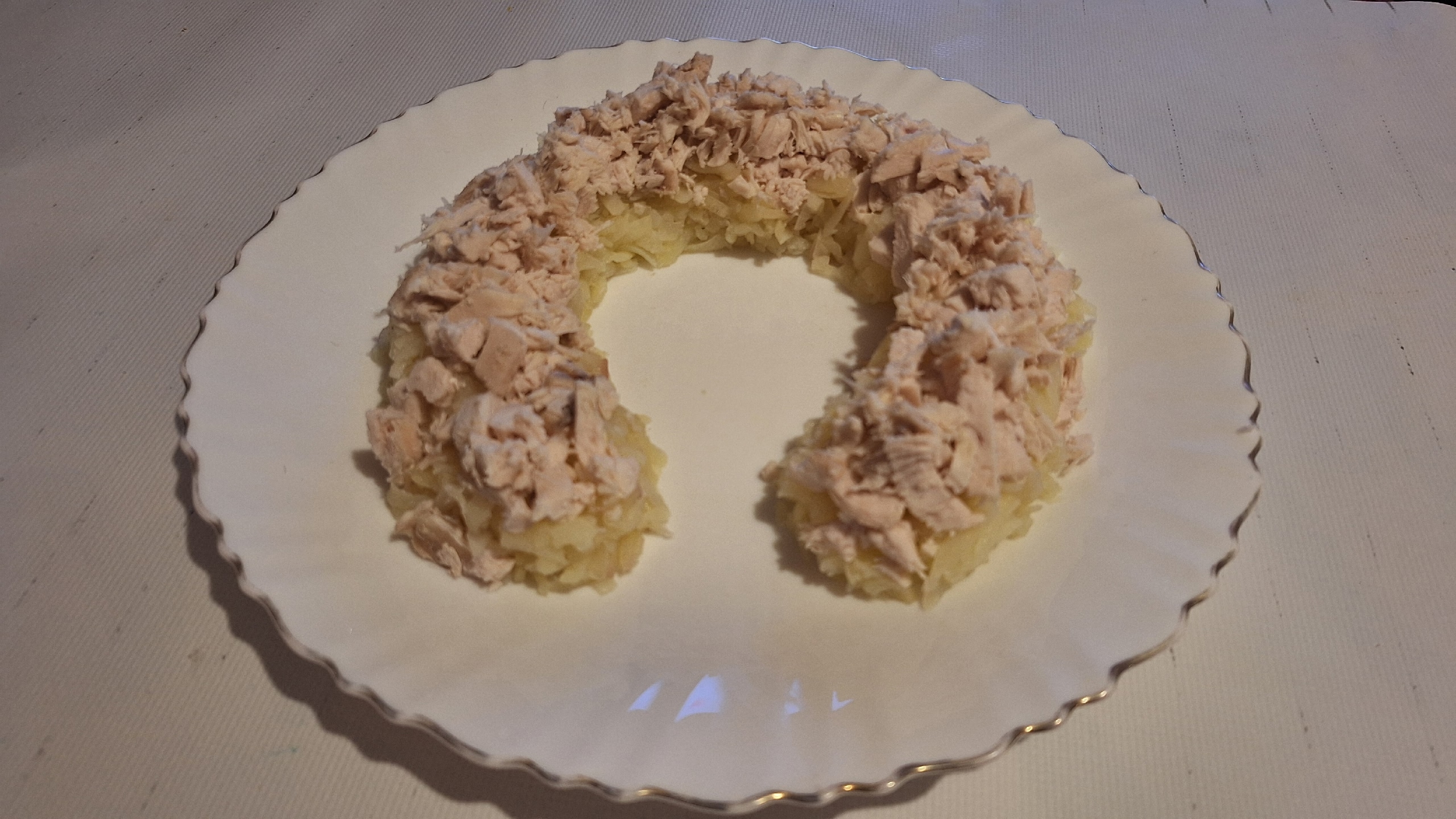 1. Натираем на крупной тёрке картофель. Выкладываем его на плоскую тарелку в форме подковы, сверху наносим майонез.