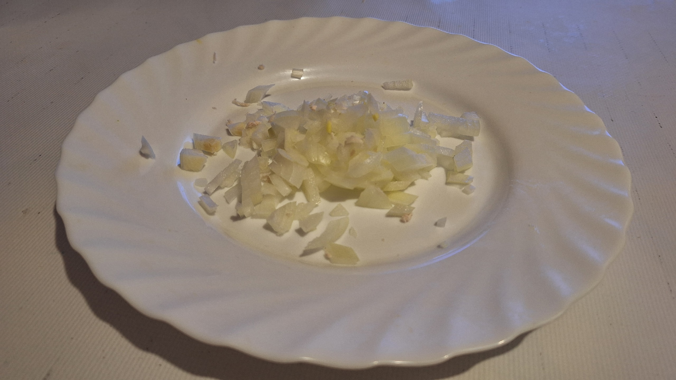 3. Лук мелко нарезаем и выкладываем следующим слоем.