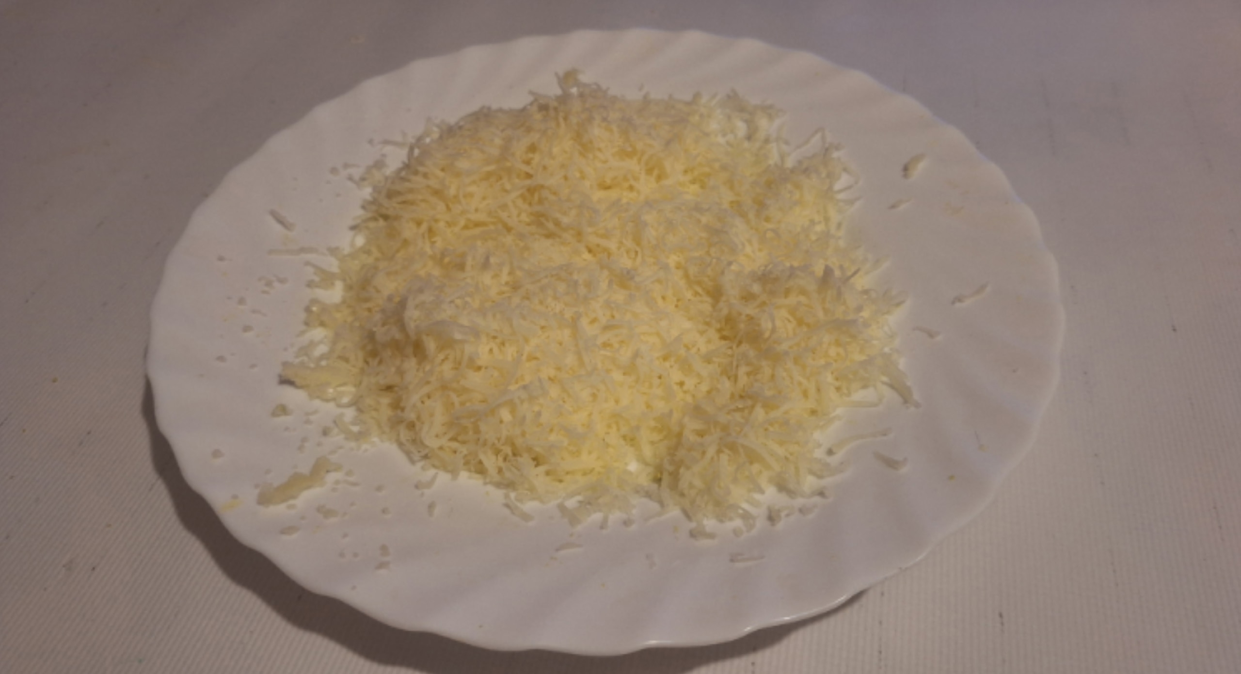 7. На мелкой тёрке натираем сыр и укладываем ещё один слой.