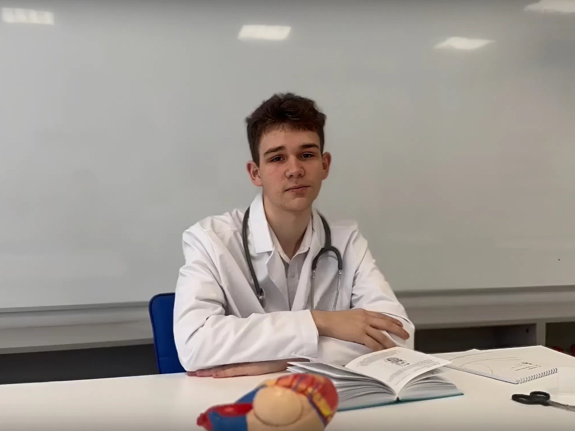 Победитель — Денис Простаков (Волоконовская школа № 1). В своём видео он поделился воспоминаниями, как стал участвовать в дополнительных занятиях медицинского класса. Одно объявление о наборе учеников — и вот он уже полностью погружён в подготовку к будущей профессии. Сейчас Денис даже может первично проконсультировать близких, если у них есть какие‑то жалобы, и подсказать, к какому врачу обратиться.