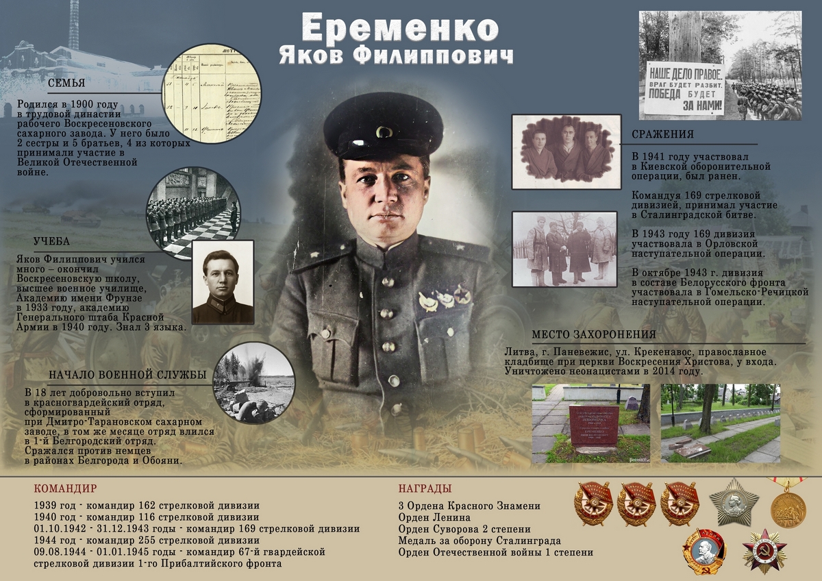 Работа Ярослава Бабкина представлена в формате страницы-презентации и посвящена генерал-майору Якову Филипповичу Еременко, уроженцу деревне Воскресенской (ныне п. Октябрьский Белгородского округа).
