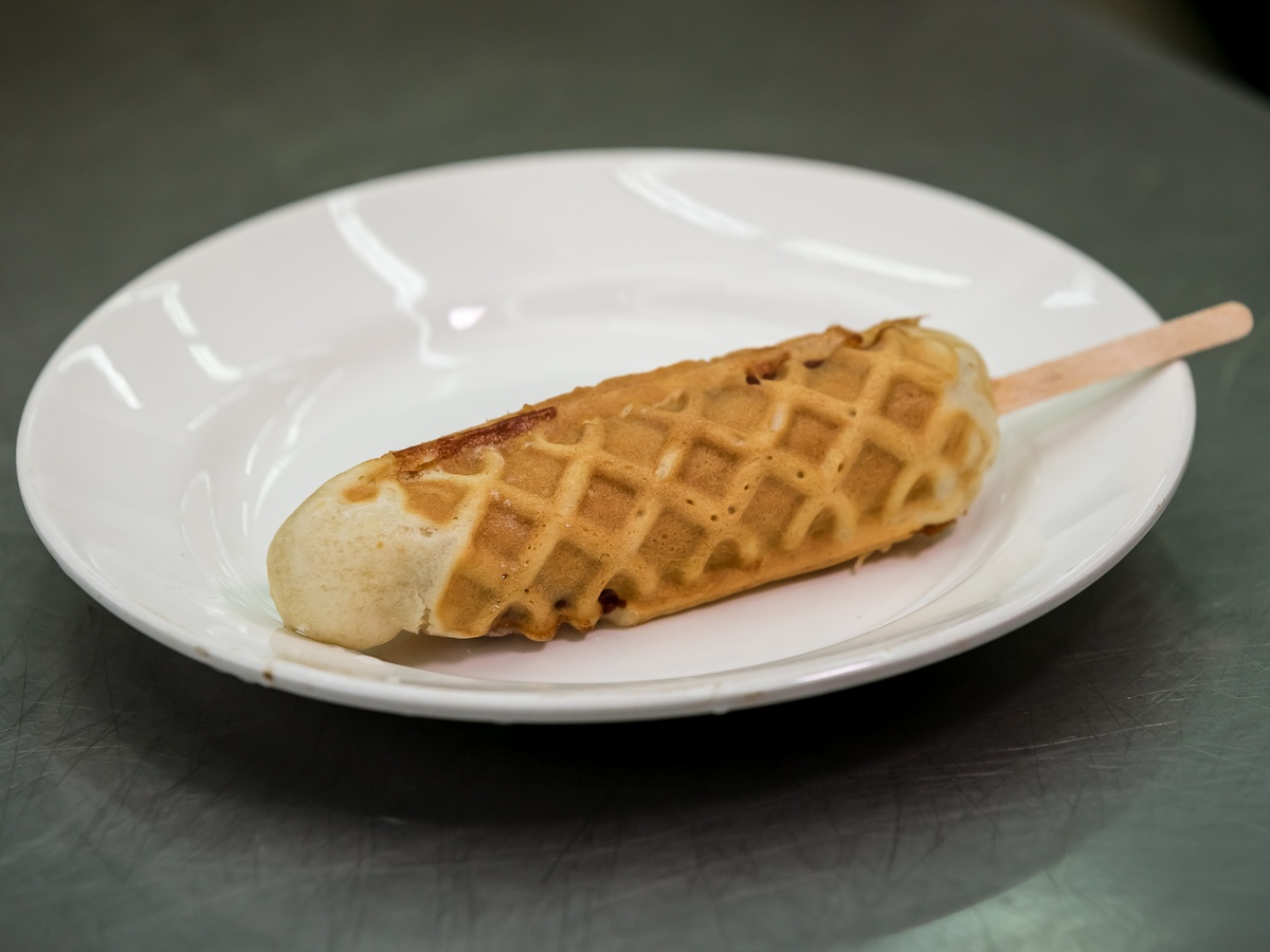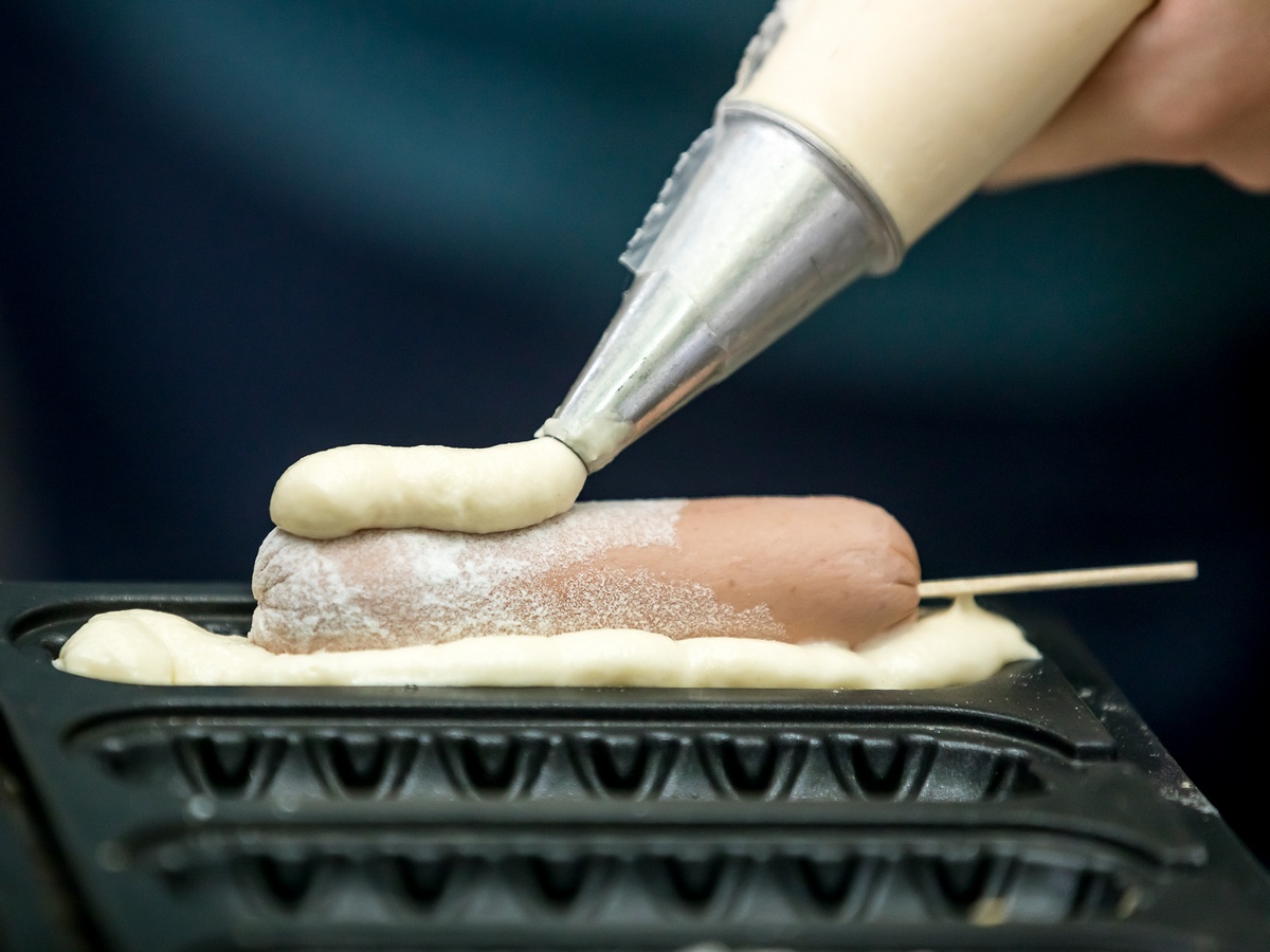 «Сначала мы обваливаем сосиску в муке, а затем обволакиваем слоем вафельного теста – оно состоит из яиц, муки, сливочного масла, молока и сахара. Массу выкладываем в ниши специального аппарата, похожего на вафельницу, погружаем в неё сосиски и жарим», – пояснила преподаватель.