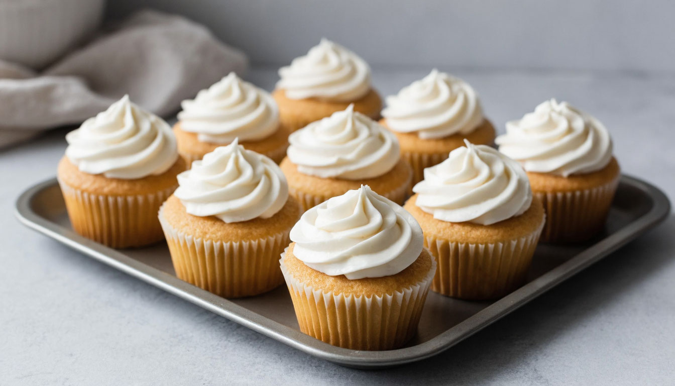 Приготовим ванильное тесто для капкейков. В миске просеиваем муку (можно просеять 2 раза), добавляем разрыхлитель. В миску миксера кладём мягкое сливочное масло. Взбиваем, пока масло не станет белым. Не прекращая взбивать, добавляем сахар. Продолжаем взбивать ещё 1–2 минуты. Добавляем поочерёдно яйца и ванильный сахар. Взбиваем до того момента, пока масса не станет белой. Снимаем смесь со стенок и перемешиваем, чтобы тесто получилось однородным. Снижаем скорость вращения миксера, добавляем муку и молоко. Муку и молоко добавляем по очереди в три приёма. С помощью кондитерского мешка, механической ложки для мороженого или обычной столовой ложки раскладываем тесто в бумажные формочки (заполняем на 2/3). Выпекаем капкейки в разогретой до 180°C духовке приблизительно 20 минут. Готовность можно проверить деревянной палочкой.