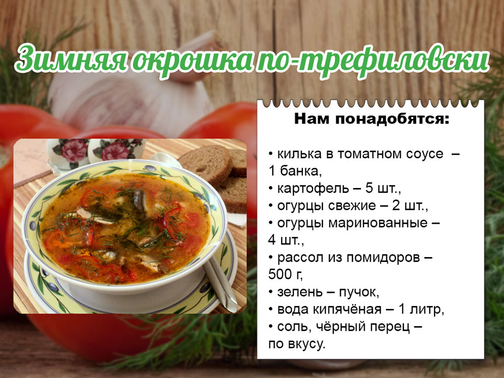 8. В смесь влейте рассол из маринованных помидоров и остывшую воду. Всё! Зимняя окрошка по‑трефиловски готова, её можно разливать по тарелкам!