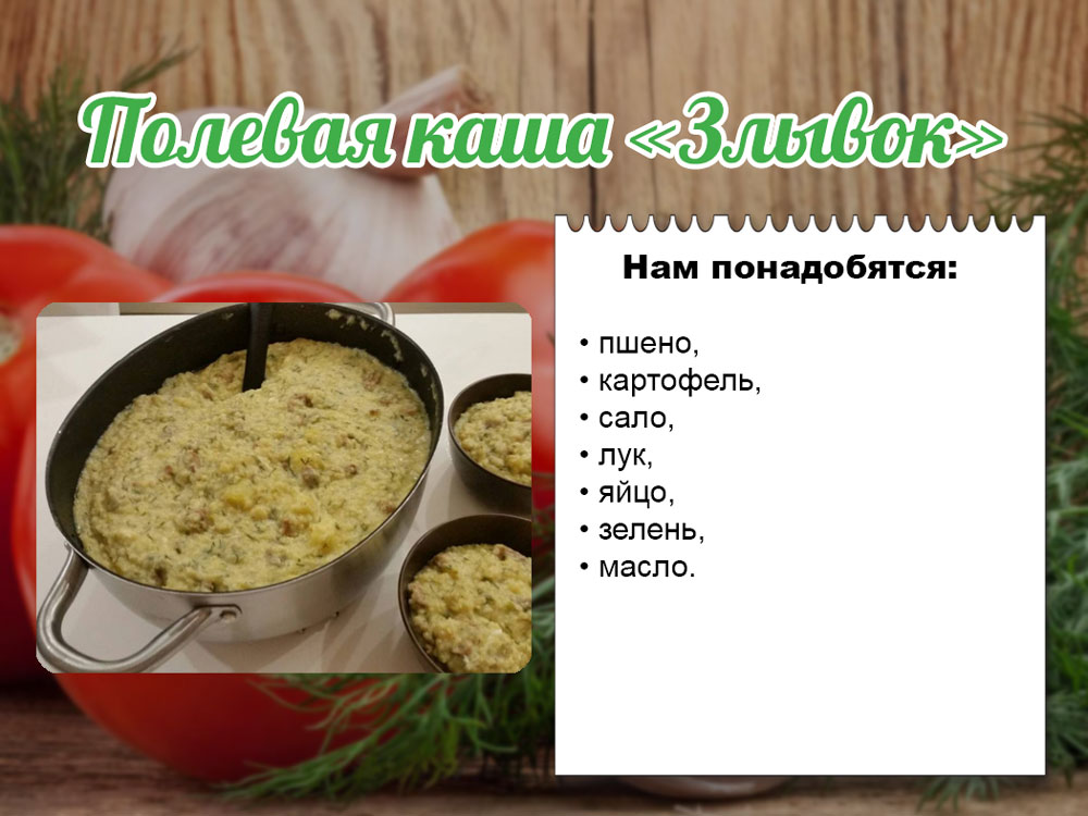 В селе Ракитном готовили на костре полевую кашу «Злывок». Название дало соседство с Украиной, так как по‑русски значило «сливать». В котелке получалось сразу два блюда: и каша, и суп. Суп сливали в другую посуду, каша оставалась, вот вам и злывок!